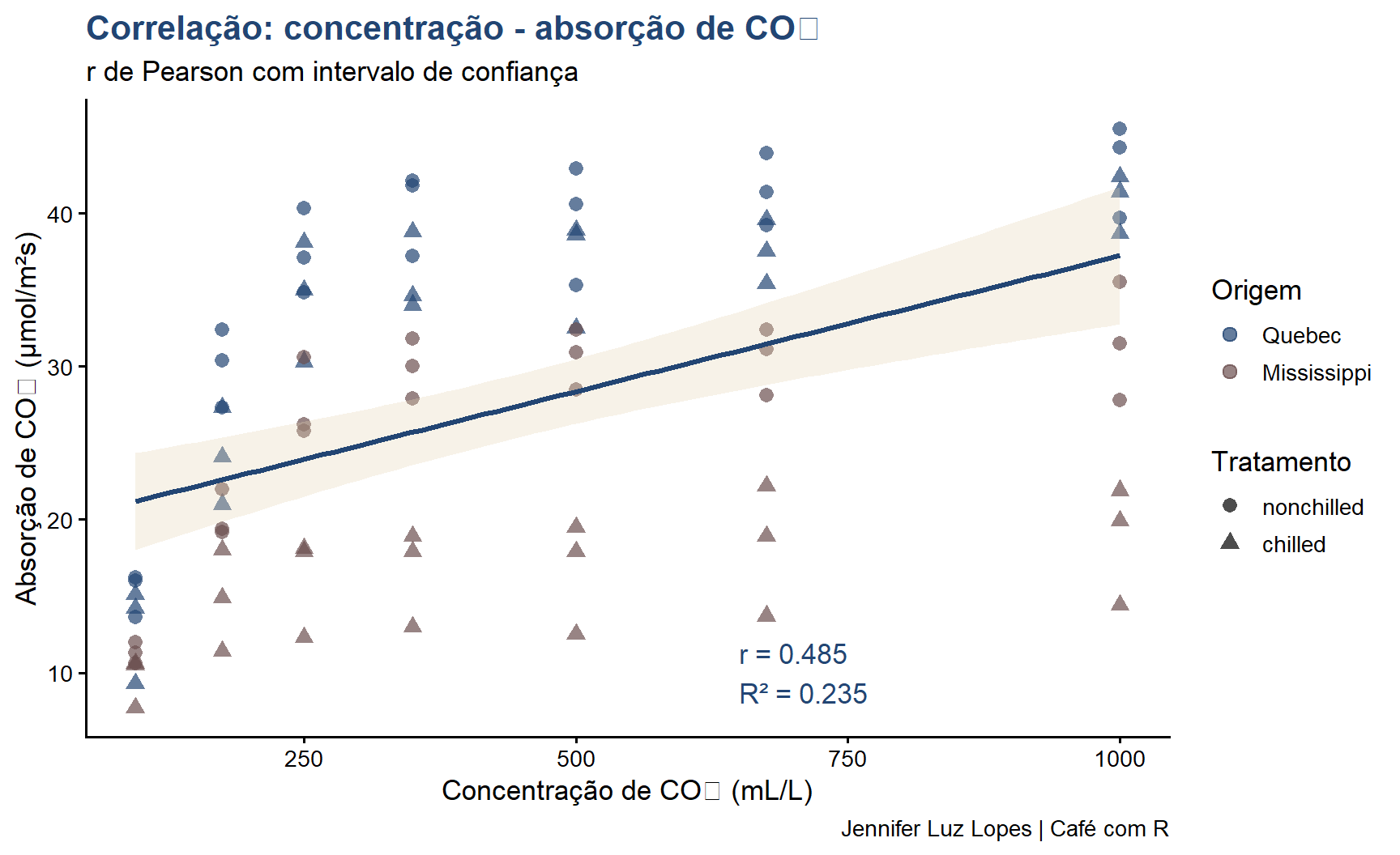 r_val <-round(cor_pearson$estimate, 3)r2_val <-round(cor_pearson$estimate^2, 3)ggplot(CO2, aes(x = conc, y = uptake)) +geom_point(aes(color = Type, shape = Treatment),size =2.8, alpha =0.7) +geom_smooth(method ="lm",color ="#224573",fill ="#E5D3B3",alpha =0.3) +scale_color_manual(values =c("#224573", "#6B4F4F")) +annotate("text",x =max(CO2$conc) *0.65,y =min(CO2$uptake) *1.3,label =paste0("r = ", r_val, "\nR² = ", r2_val),color ="#224573",size =4.5,hjust =0) +labs(title ="Correlação: concentração - absorção de CO₂",subtitle ="r de Pearson com intervalo de confiança",x ="Concentração de CO₂ (mL/L)",y ="Absorção de CO₂ (μmol/m²s)",color ="Origem",shape ="Tratamento",caption ="Jennifer Luz Lopes | Café com R") +theme_classic(base_size =13) +theme(plot.title =element_text(color ="#224573", face ="bold"),legend.position ="right")