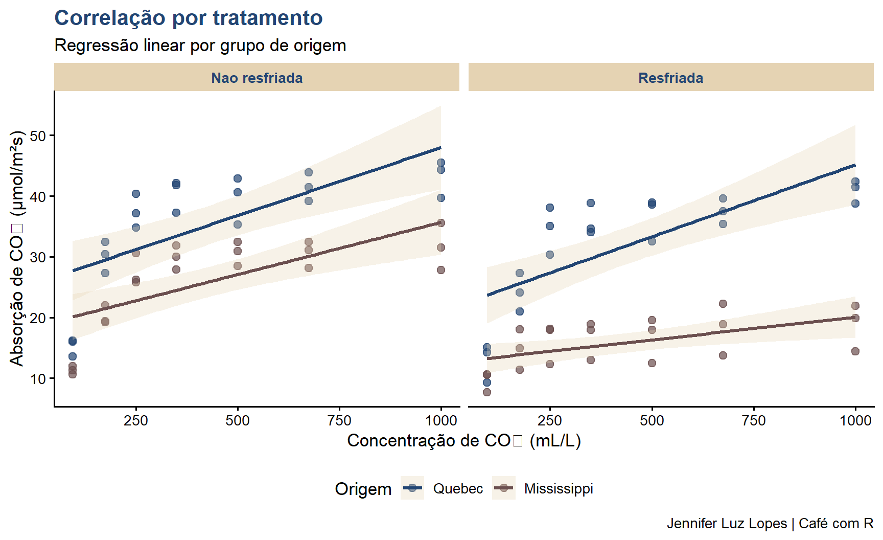 ggplot(CO2, aes(x = conc, y = uptake, color = Type)) +geom_point(size =2.5, alpha =0.7) +geom_smooth(method ="lm", se =TRUE, fill ="#E5D3B3", alpha =0.3) +facet_wrap(~Treatment,labeller =labeller(Treatment =c("nonchilled"="Nao resfriada","chilled"="Resfriada"))) +scale_color_manual(values =c("#224573", "#6B4F4F")) +labs(title ="Correlação por tratamento",subtitle ="Regressão linear por grupo de origem",x ="Concentração de CO₂ (mL/L)",y ="Absorção de CO₂ (μmol/m²s)",color ="Origem",caption ="Jennifer Luz Lopes | Café com R") +theme_classic(base_size =13) +theme(plot.title =element_text(color ="#224573", face ="bold"),strip.background =element_rect(fill ="#E5D3B3", color =NA),strip.text =element_text(color ="#224573", face ="bold"),legend.position ="bottom")