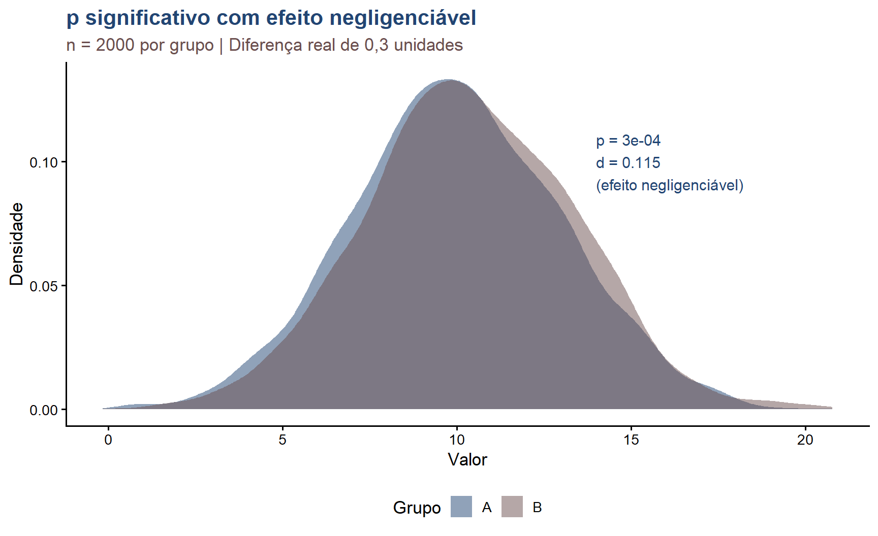set.seed(99)n <-2000df_demo <-data.frame(grupo =rep(c("A", "B"), each = n),valor =c(rnorm(n, 10.0, 3), rnorm(n, 10.3, 3)))teste_demo <-t.test(valor ~ grupo, data = df_demo)d_demo <- effectsize::cohens_d(valor ~ grupo, data = df_demo)ggplot(df_demo, aes(x = valor, fill = grupo)) +geom_density(alpha =0.5, color =NA) +scale_fill_manual(values =c("#224573", "#6B4F4F")) +annotate("text", x =14, y =0.10,label =paste0("p = ", round(teste_demo$p.value, 4),"\nd = ", round(abs(d_demo$Cohens_d), 3),"\n(efeito negligenciável)"),color ="#224573", size =4, hjust =0) +labs(title ="p significativo com efeito negligenciável",subtitle =paste0("n = ", n, " por grupo | Diferença real de 0,3 unidades"),x ="Valor",y ="Densidade",fill ="Grupo") +theme_classic(base_size =13) +theme(plot.title =element_text(color ="#224573", face ="bold"),plot.subtitle =element_text(color ="#6B4F4F"),legend.position ="bottom")