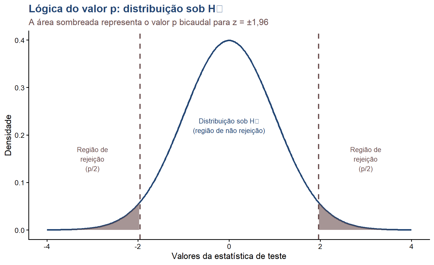 # Visualização da distribuição sob H0 e o valor pset.seed(123)# Parâmetrosmedia_h0 <-0dp <-1z_obs <-1.96# valor observado que gera p ≈ 0.05x <-seq(-4, 4, length.out =400)y <-dnorm(x, mean = media_h0, sd = dp)df_curva <-data.frame(x = x, y = y)# Região de rejeição (bicaudal)df_rej_dir <- df_curva |>filter(x >= z_obs)df_rej_esq <- df_curva |>filter(x <=-z_obs)ggplot(df_curva, aes(x = x, y = y)) +geom_line(color ="#224573", linewidth =1.2) +geom_area(data = df_rej_dir,aes(x = x, y = y),fill ="#6B4F4F", alpha =0.6) +geom_area(data = df_rej_esq,aes(x = x, y = y),fill ="#6B4F4F", alpha =0.6) +geom_vline(xintercept =c(-z_obs, z_obs),color ="#6B4F4F", linetype ="dashed", linewidth =1) +annotate("text", x =3, y =0.15,label ="Região de\nrejeição\n(p/2)",color ="#6B4F4F", size =3.5, hjust =0.5) +annotate("text", x =-3, y =0.15,label ="Região de\nrejeição\n(p/2)",color ="#6B4F4F", size =3.5, hjust =0.5) +annotate("text", x =0, y =0.22,label ="Distribuição sob H₀\n(região de não rejeição)",color ="#224573", size =3.5, hjust =0.5) +labs(title ="Lógica do valor p: distribuição sob H₀",subtitle ="A área sombreada representa o valor p bicaudal para z = ±1,96",x ="Valores da estatística de teste",y ="Densidade") +theme_classic(base_size =13) +theme(plot.title =element_text(color ="#224573", face ="bold"),plot.subtitle =element_text(color ="#6B4F4F"))